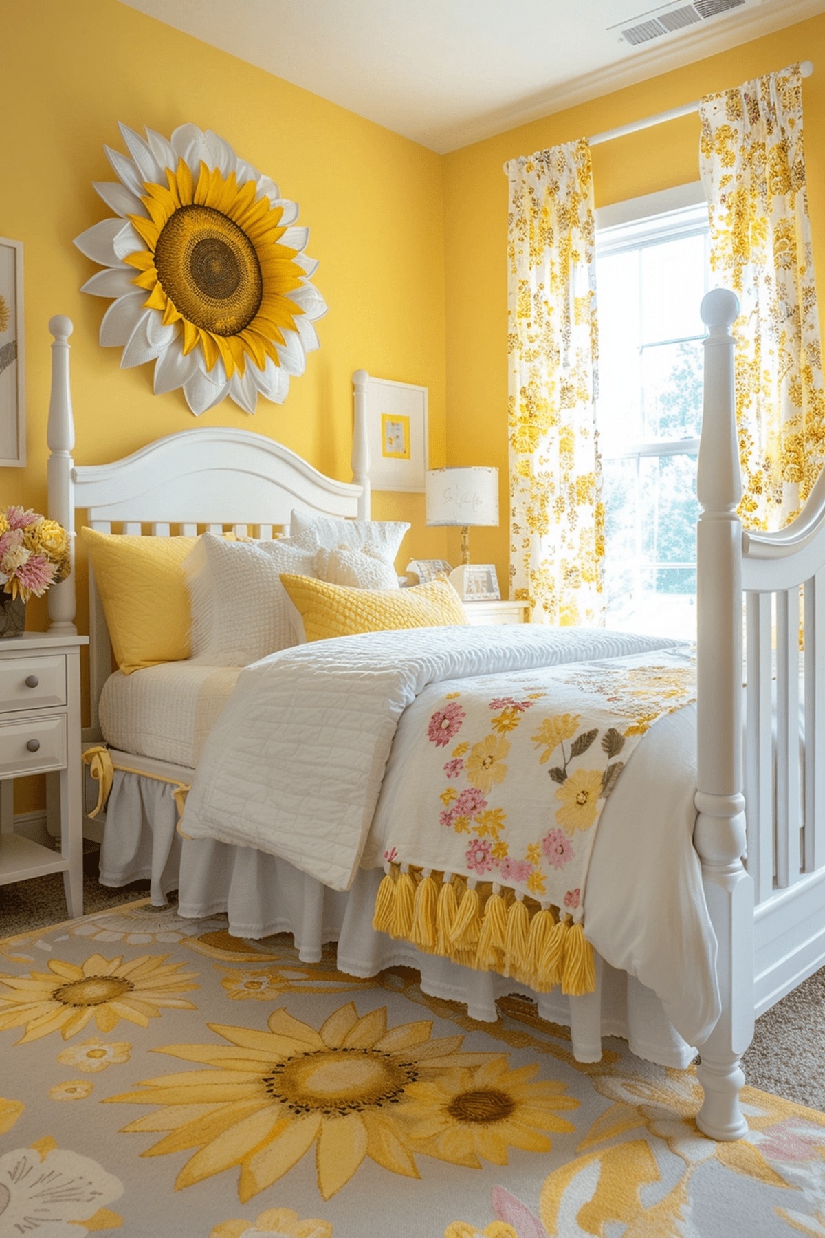 Floral patterns on bedding and curtains add a touch of whimsy while enhancing the room's sunny vibe.