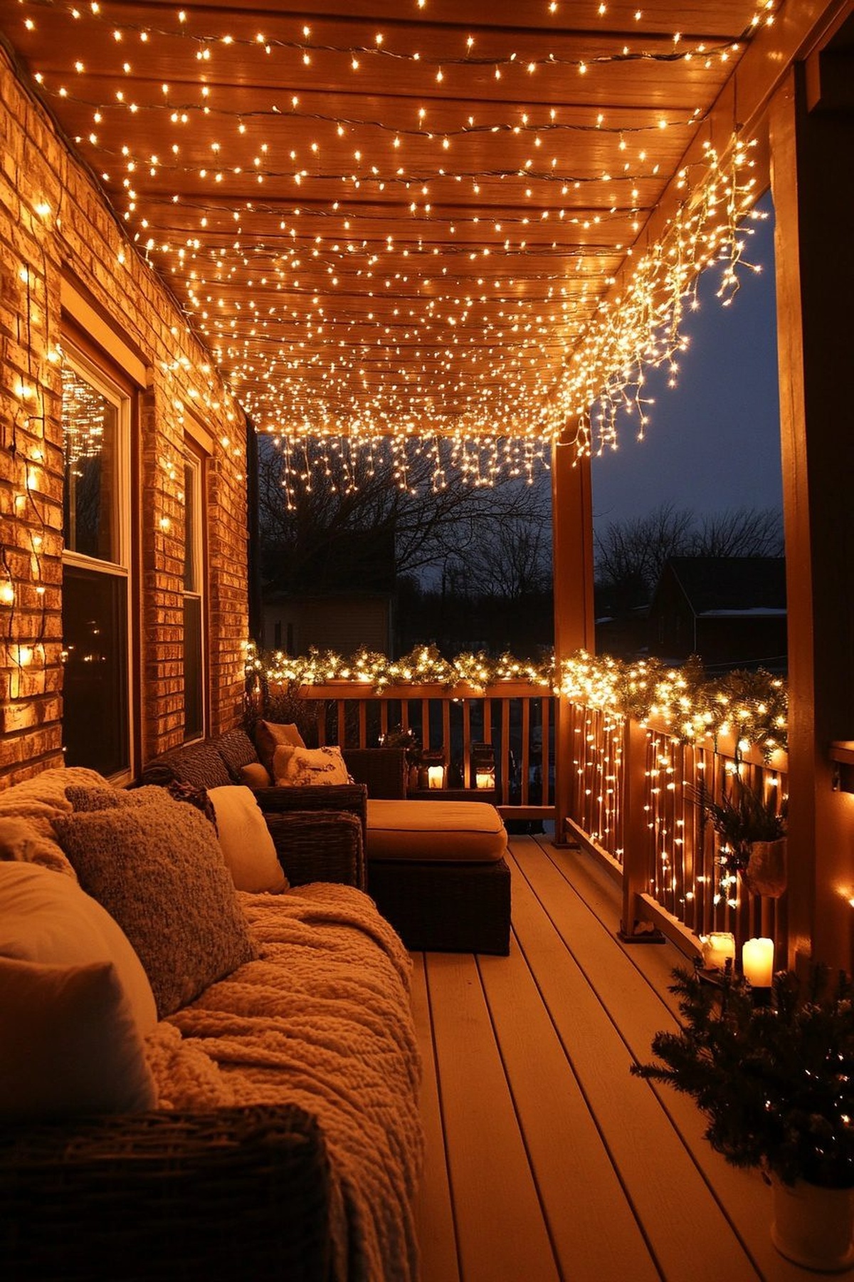 A cozy porch adorned with twinkling fairy lights invites warmth and cheer during the holiday season.