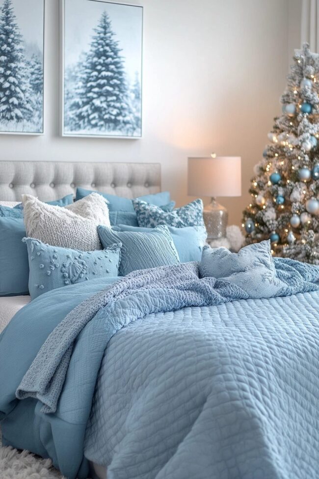 Soft shades of icy blue and white create a calming atmosphere, inviting relaxation during the festive season.